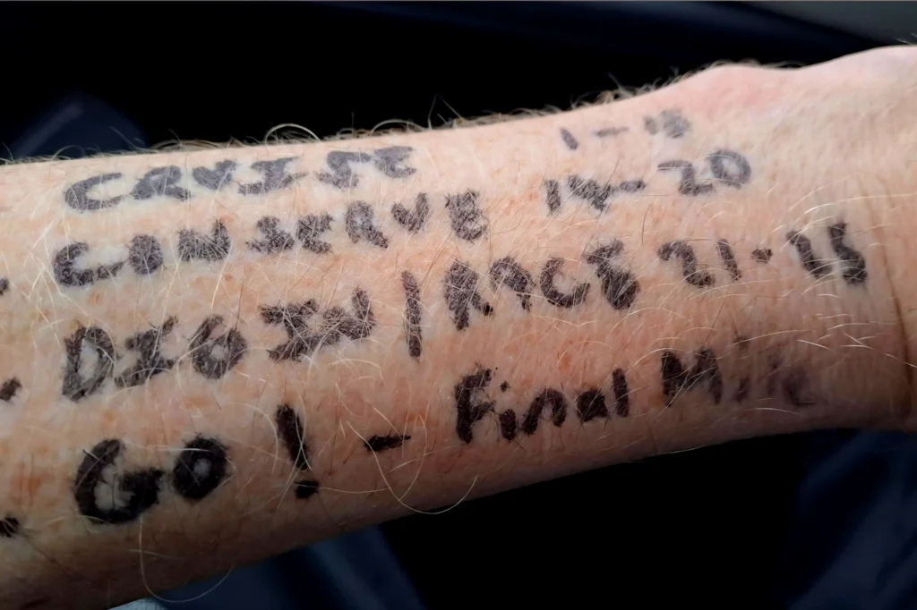My plan was to go easy for the first half, keep plucking away until the twenty-mile marker and then try and race the last 10k. I’d read so much about not starting too fast, not worrying about being overtaken and just going very easy during the first half of the race. So as not to ruin the run, go too fast or blow up I’d written the following on my arm: